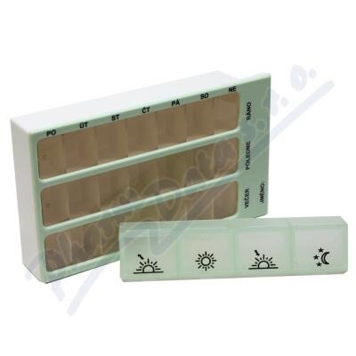 Jedná se o dávkovač - kazetu na léky na celý týden v setu s denním dávkovačem na léky, který má 4 přihrádky a slouží k přehlednému a spolehlivému dávkování a uložení léků doma i na cestách.