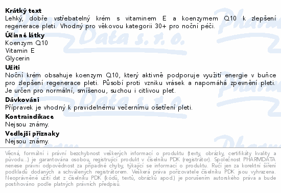 Lehký, dobře vstřebatelný krém s vitaminem E a koenzymem Q10 k zlepšení regenerace pleti. Vhodný pro věkovou kategorii 30+ pro noční péči.