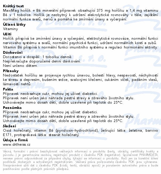 MaxiMag hořčík + B6 minerální přípravek obsahující 375 mg hořčíku a 1,4 mg vitaminu B6 v 1 tobolce. Hořčík je nezbytný k udržení elekrolytické rovnováhy v těle, zajištění normální funkce svalů, nervů a pomáhá ke zmírnění únavy a vyčerpání.