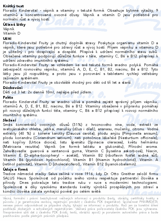 Floradix Kindervital - vápník a vitamíny v tekuté formě. Obsahuje bylinné výtažky, 9 vitamínů a koncentrované ovocné džusy. Vápník a vitamín D jsou potřebné pro normální růst a vývoj kostí.