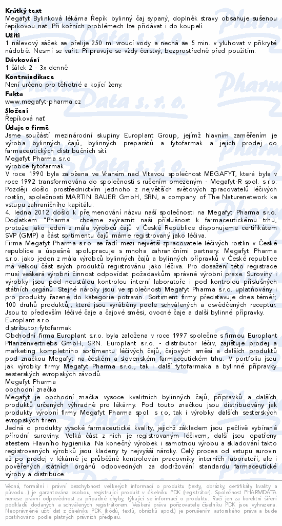 Megafyt Bylinková lékárna Řepík bylinný čaj sypaný, doplněk stravy obsahuje sušenou řepíkovou nať. Při kožních problémech lze přidávat i do koupelí.