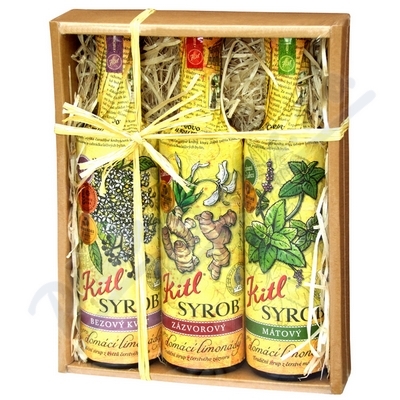 Dárkové balení Kitl Syrobů. Jsou to sirupy pro přípravu tradičních domácích limonád, vyrobené z čerstvých bylin v BIO kvalitě. Bezový z ručně sbíraných květů bezu černého, Zázvorový z ručně lisovaného kořene zázvoru, Mátový z čerstvých lístků máty.