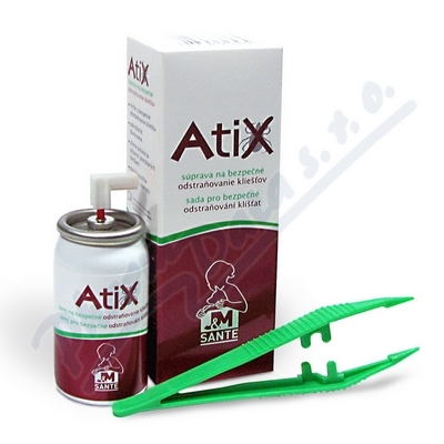 ATIX je zdravotnický prostředek, který je určen k bezpečnému odstraňování klíšťat, přisátých na kůži. Sprej se aplikuje na klíště, u kterého se vyvolá silný mrazící účinek. Tím se účinně omezí přenos tělních tekutin z klíštěte do rány.