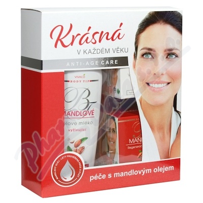 Dárková kosmetická kazeta Krásná v každém věku s mandlovým olejem obsahuje: mandlové tělové mléko 400ml, mandlový pleťový krém denní 50ml, mandlový pleťový krém noční 50ml.