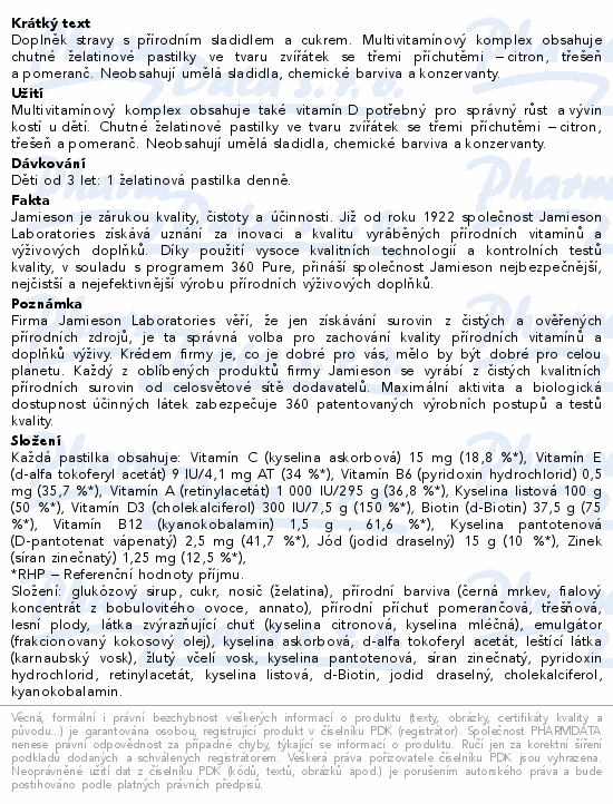 Doplněk stravy s přírodním sladidlem a cukrem. Multivitamínový komplex obsahuje chutné želatinové pastilky ve tvaru zvířátek se třemi příchutěmi – citron, třešeň a pomeranč. Neobsahují umělá sladidla, chemické barviva a konzervanty.