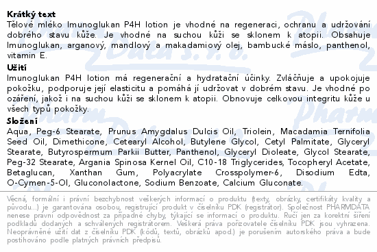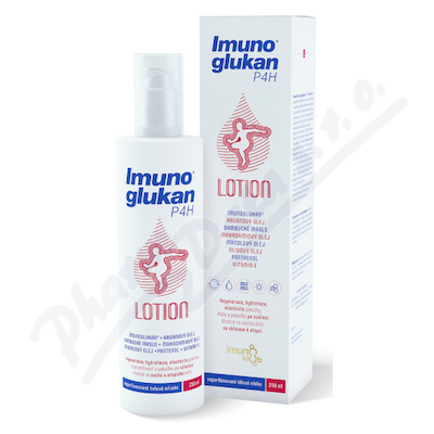 Tělové mléko Imunoglukan P4H lotion je vhodné na regeneraci, ochranu a udržování dobrého stavu kůže. Je vhodné na suchou kůži se sklonem k atopii. Obsahuje Imunoglukan, arganový, mandlový a makadamiový olej, bambucké máslo, panthenol, vitamin E.