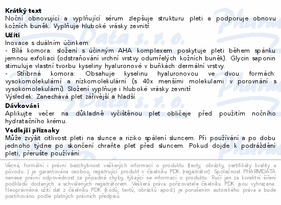 Noční obnovující a vyplňující sérum zlepšuje strukturu pleti a podporuje obnovu kožních buněk. Vyplňuje hluboké vrásky zevnitř.