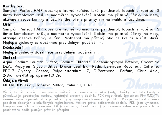 Šampon Perfect HAIR obsahuje kromě kofeinu také panthenol, lopuch a kopřivu. S tímto komplexem snižuje nadměrné vypadávání. Kofein má příznivé účinky na vlasy, aktivuje vlasové kořínky a růst. Panthenol má příznivý vliv na kvalitu a růst vlasů.