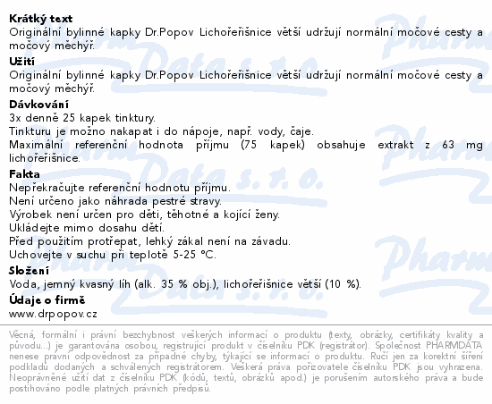 Originální bylinné kapky Dr.Popov Lichořeřišnice větší udržují normální močové cesty a močový měchýř.