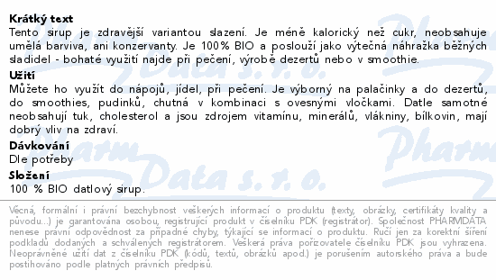 Tento sirup je zdravější variantou slazení. Je méně kalorický než cukr, neobsahuje umělá barviva, ani konzervanty. Je 100% BIO a poslouží jako výtečná náhražka běžných sladidel - bohaté využití najde při pečení, výrobě dezertů nebo v smoothie.