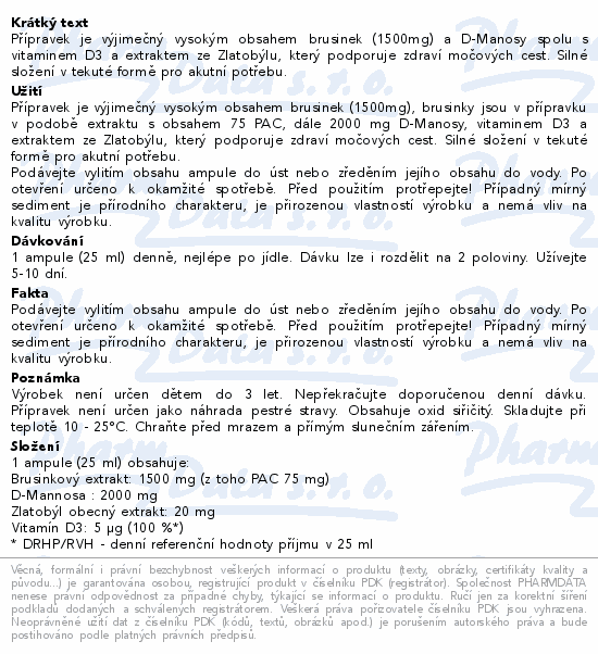Přípravek je výjimečný vysokým obsahem brusinek (1500mg) a D-Manosy spolu s vitaminem D3 a extraktem ze Zlatobýlu, který podporuje zdraví močových cest. Silné složení v tekuté formě pro akutní potřebu.