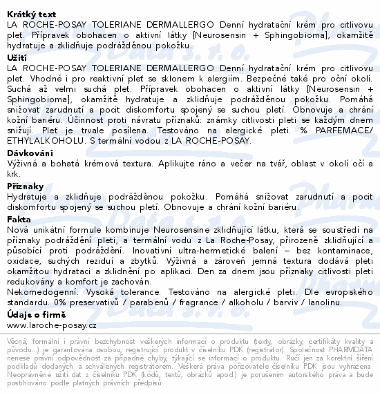 LA ROCHE-POSAY TOLERIANE DERMALLERGO Denní hydratační krém pro citlivovu pleť. Přípravek obohacen o aktivní látky [Neurosensin + Sphingobioma], okamžitě hydratuje a zklidňuje podrážděnou pokožku.