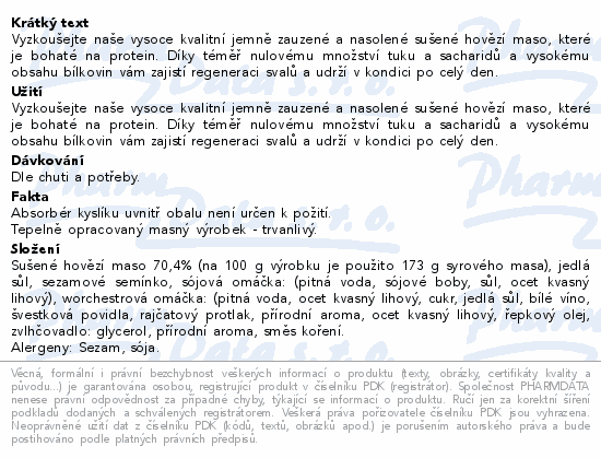 Vyzkoušejte naše vysoce kvalitní jemně zauzené a nasolené sušené hovězí maso, které je bohaté na protein. Díky téměř nulovému množství tuku a sacharidů a vysokému obsahu bílkovin vám zajistí regeneraci svalů a udrží v kondici po celý den.