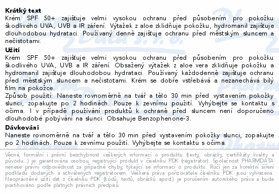 Krém SPF 50+ zajišťuje velmi vysokou ochranu před působením pro pokožku škodlivého UVA, UVB a IR záření. Výtažek z aloe zklidňuje pokožku, hydromanil zajišťuje dlouhodobou hydrataci. Používaný denně zajišťuje ochranu před městským sluncem a nečistotami.
