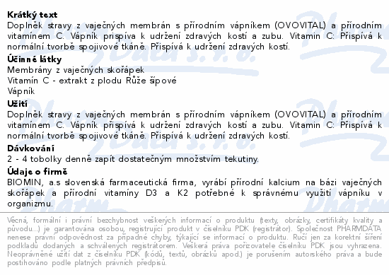Doplněk stravy z vaječných membrán s přírodním vápníkem (OVOVITAL) a přírodním vitamínem C. Vápník prispíva k udržení zdravých kostí a zubu. Vitamin C: Přispívá k normální tvorbě spojivové tkáně. Přispívá k udržení zdravých kostí.