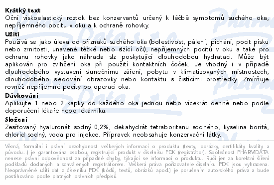 Oční viskoelastický roztok bez konzervantů určený k léčbě symptomů suchého oka, nepříjemného pocitu v oku a k ochraně rohovky.