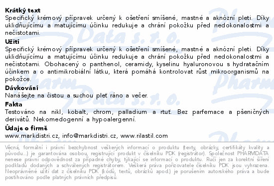 Specifický krémový přípravek určený k ošetření smíšené, mastné a aknózní pleti. Díky uklidňujícímu a matujícímu účinku redukuje a chrání pokožku před nedokonalostmi a nečistotami.