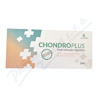 Chondroplus je jedinečná injekční forma kombinace neživočišné kyseliny hyaluronové (40 mg/2 ml) a syntetického peptidu pro zlepšení fyzické funkce kloubů a snížení bolesti.