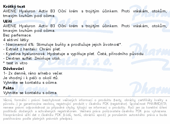 AVENE Hyaluron Activ B3 Oční krém s trojitým účinkem. Proti vráskám, otokům, tmavým kruhům pod očima.