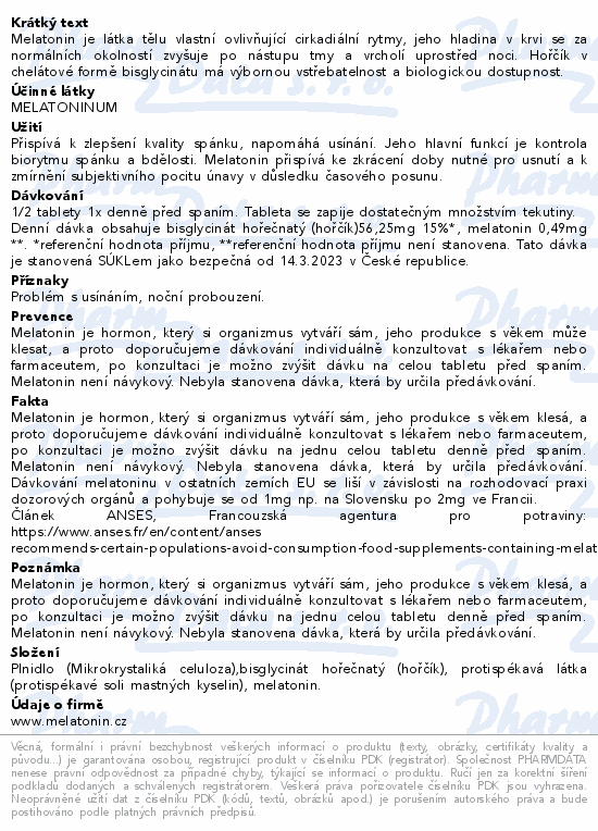 Melatonin je látka tělu vlastní ovlivňující cirkadiální rytmy, jeho hladina v krvi se za normálních okolností zvyšuje po nástupu tmy a vrcholí uprostřed noci. Hořčík v chelátové formě bisglycinátu má výbornou vstřebatelnost a biologickou dostupnost.