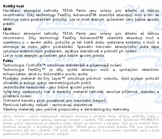 Navlékací absorpční kalhotky TENA Pants jsou určeny pro střední až těžkou inkontinenci. Díky technologii FeelDry AdvancedTM okamžitě absorbují moč a tím se eliminuje riziko podráždění pokožky. Lze je nosit stejným způsobem jako běžné spodní prádlo.