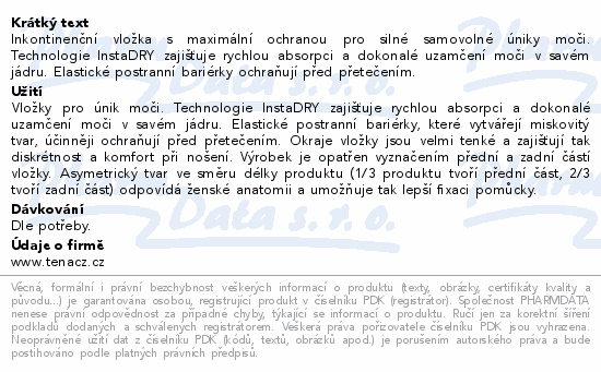 Inkontinenční vložka s maximální ochranou pro silné samovolné úniky moči. Technologie InstaDRY zajišťuje rychlou absorpci a dokonalé uzamčení moči v savém jádru. Elastické postranní bariérky ochraňují před přetečením.
