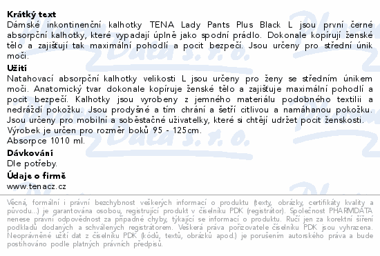Dámské inkontinenční kalhotky TENA Lady Pants Plus Black L jsou první černé absorpční kalhotky, které vypadají úplně jako spodní prádlo. Dokonale kopírují ženské tělo a zajišťují tak maximální pohodlí a pocit bezpečí. Jsou určeny pro střední únik moči.