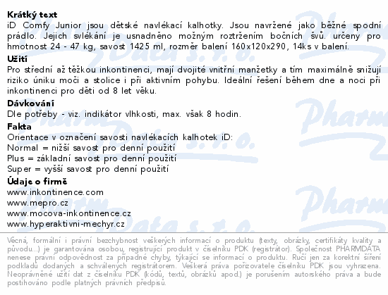 iD Comfy Junior jsou dětské navlékací kalhotky. Jsou navržené jako běžné spodní prádlo. Jejich svlékání je usnadněno možným roztržením bočních švů. určeny pro hmotnost 24 - 47 kg, savost 1425 ml, rozměr balení 160x120x290, 14ks v balení.