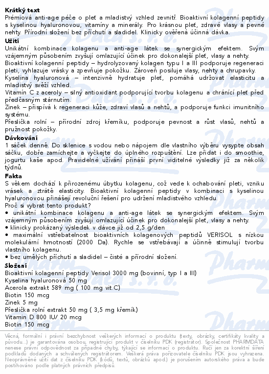 Prémiová anti-age péče o pleť a mladistvý vzhled zevnitř. Bioaktivní kolagenní peptidy s kyselinou hyaluronovou, vitamíny a minerály. Pro krásnou pleť, zdravé vlasy a pevné nehty. Přírodní složení bez příchutí a sladidel. Klinicky ověřená účinná dávka.