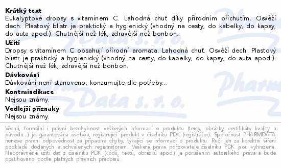 Eukalyptové dropsy s vitamínem C. Lahodná chuť díky přírodním příchutím. Osvěží dech. Plastový blistr je praktický a hygienický (vhodný na cesty, do kabelky, do kapsy, do auta apod.). Chutnější než lék, zdravější než bonbon.