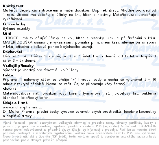 Müllerův dětský čaj s jitrocelem a mateřídouškou. Doplněk stravy. Vhodné pro děti od 1 roku. Jtrocel má zklidňující účinky na krk, hltan a hlasivky. Mateřídouška usnadňuje vykašlávání.
