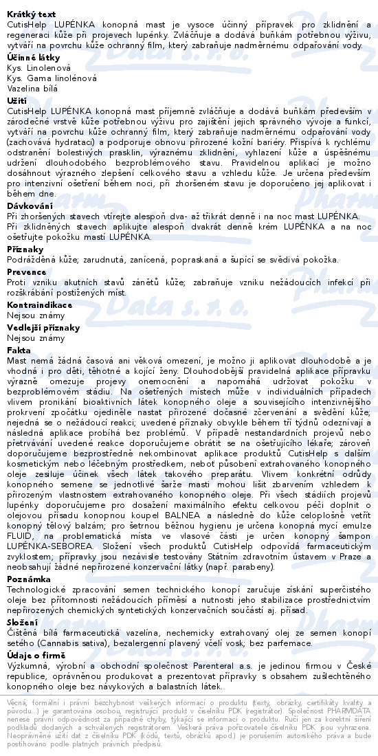 CutisHelp LUPÉNKA konopná mast je vysoce účinný přípravek pro zklidnění a regeneraci kůže při projevech lupénky. Zvláčňuje a dodává buňkám potřebnou výživu, vytváří na povrchu kůže ochranný film, který zabraňuje nadměrnému odpařování vody.